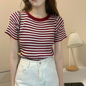 เสื้อถักลายทางคอกลมสี nnnnnnnnnnnnnnnncolor แขนสั้นแฟชั่นลำลองสำหรับผู้หญิงฤดูร้อน
